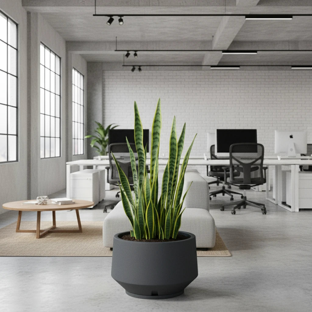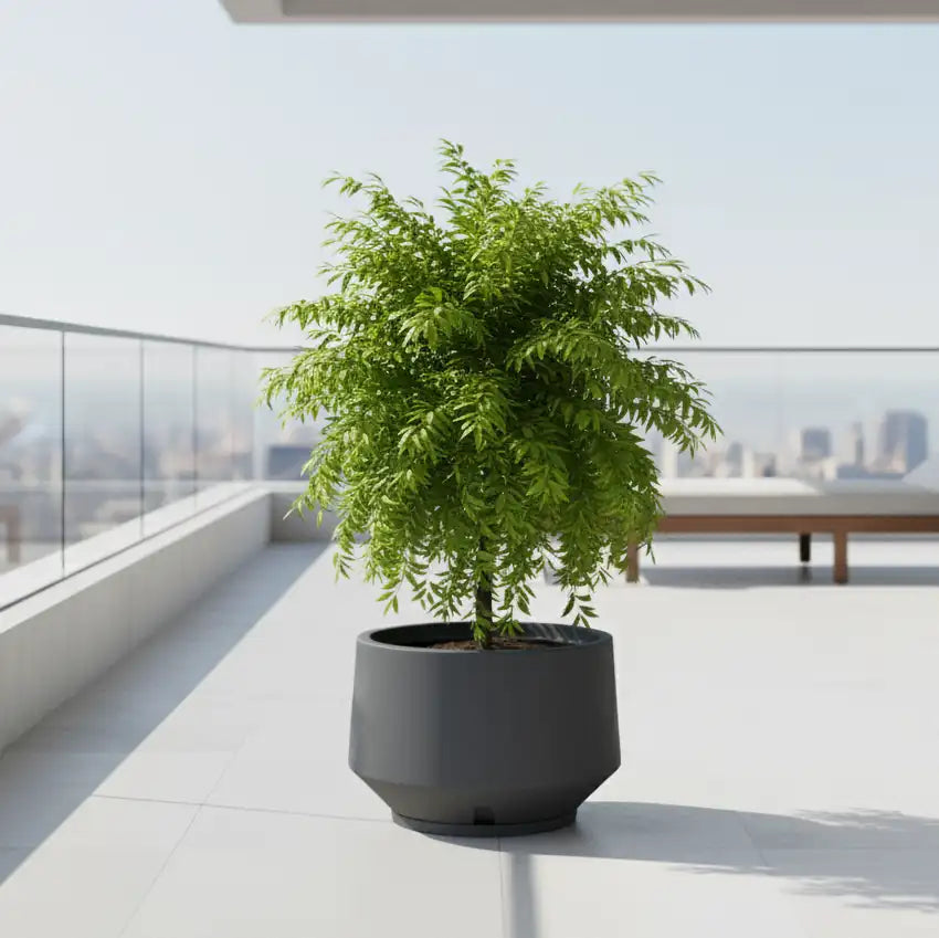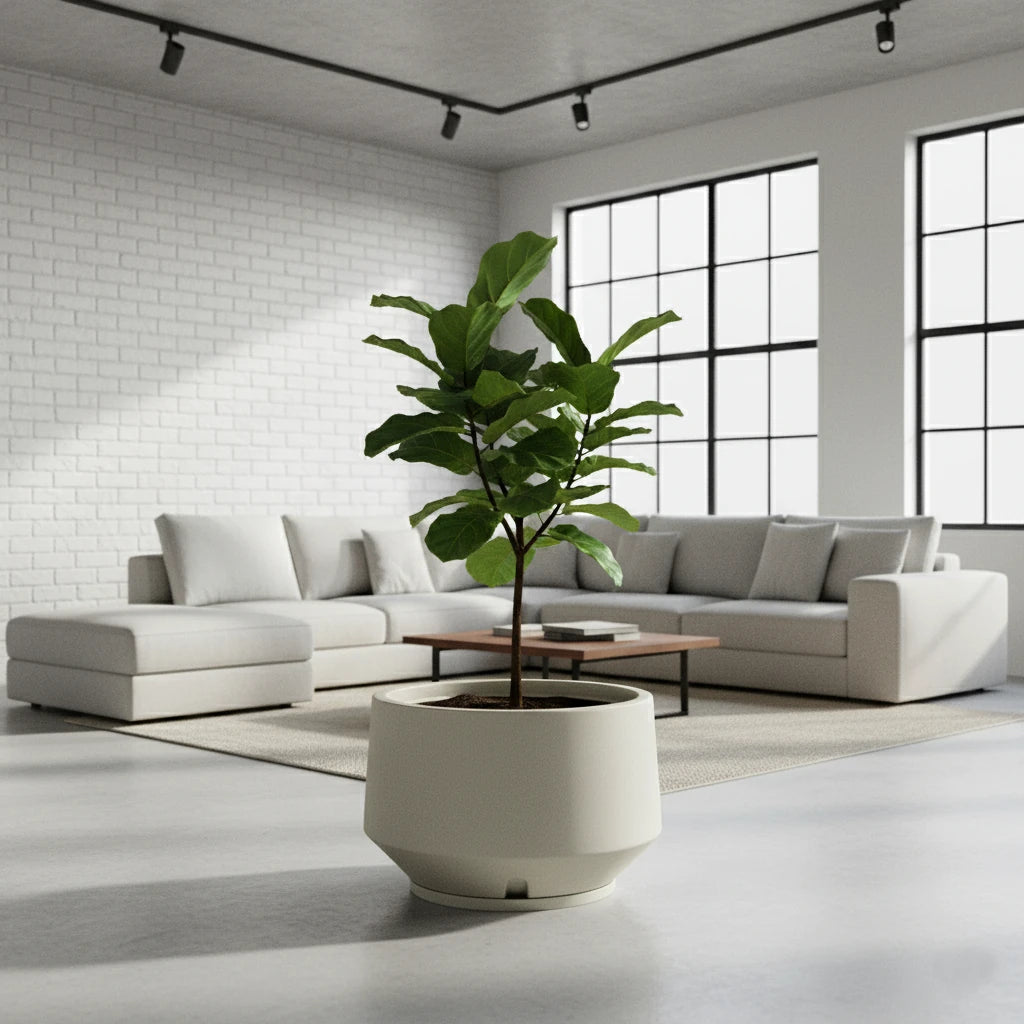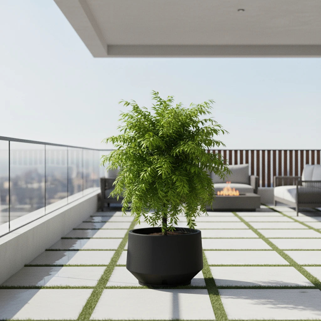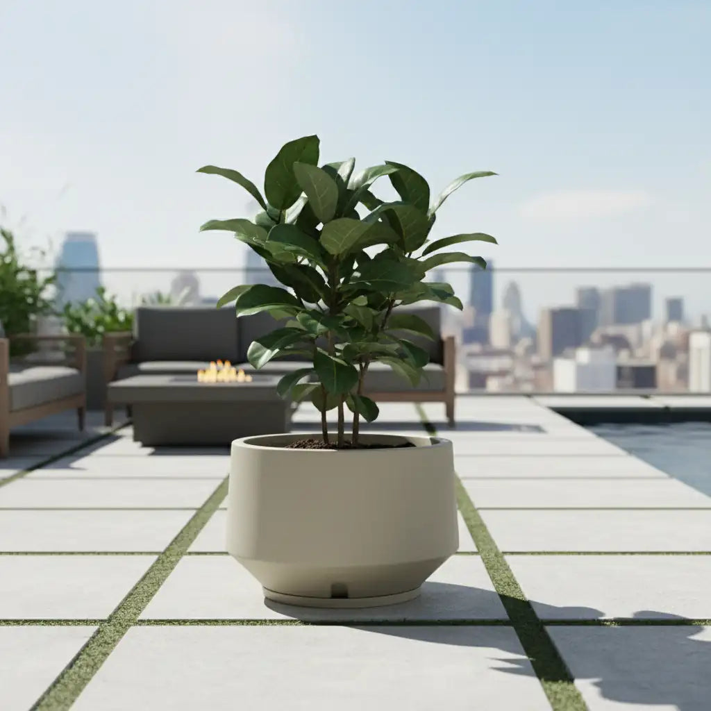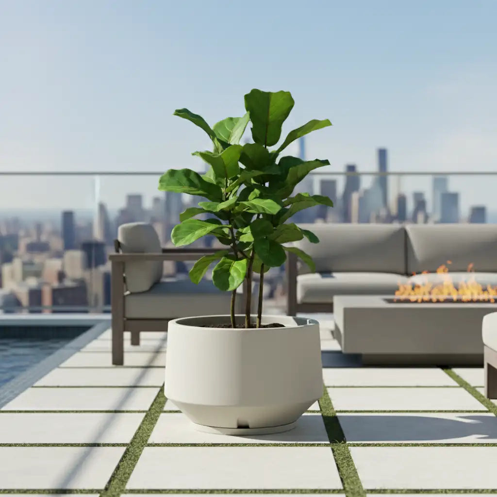 Fabricada en polietileno rotomoldeado, liviano, resistente a impactos y a los rayos UV. Superficie con textura suave tipo cemento, de aspecto natural y elegante.