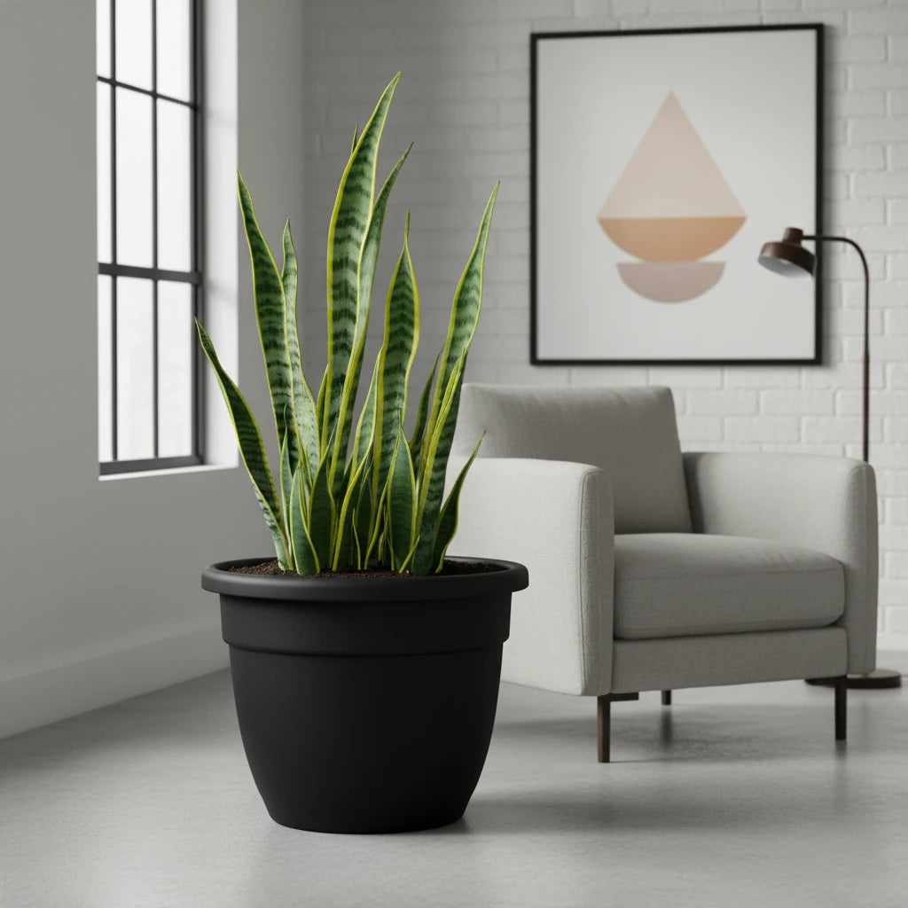 Maceta plástica modelo Eden, tipo campana, fabricada en polipropileno resistente, colores teja, arena y negro.
